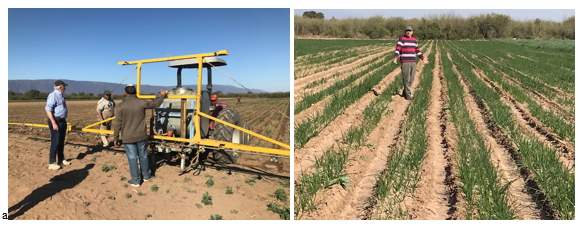 In the town of La Colonia, Santa Rosa Department, Catamarca Province, Argentina, a direct sowing of onion (Allium cepa L.) was carried out. Each experimental plot was half a hectare in size, with two crop rows per bed 50 cm wide, and a 25 cm furrow width between beds for furrow irrigation. A completely randomized experimental design with two treatments was implemented. The treatments included a control (without inoculation) and a second treatment with foliar inoculation along the crop rows using a microbial consortium.