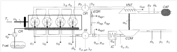 The main objective of the electronic Diesel controls is to satisfy a diverse set of confliction constraints imposed by: providing the required engine torque (steady state and transient) with minimal fuel consumption while meeting the exhaust emission laws.8 This will necessitate an optimal coordination of the EGR, turbocharger, and injection systems. Adding to that the complexity of the modern engine Diesel that includes, besides the reciprocating part, many other modules as shown in Figure 1.