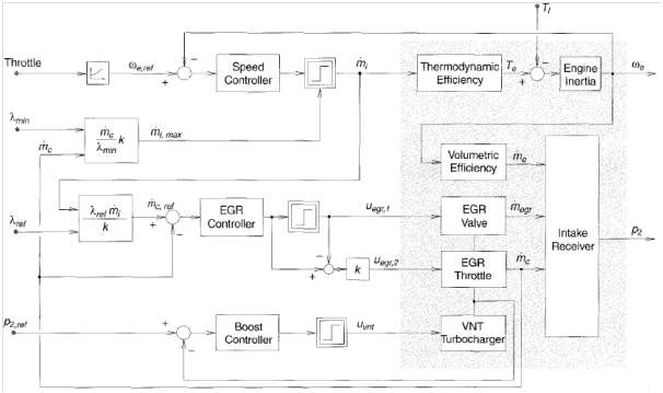 Sliding mode control: Through the past two decades, sliding mode control has shown a great performance in nonlinear-systems control since it has excellent robustness properties. However, the main issue is that some systems cannot handle the switching effect. In9 a sliding mode controller is utilized to solve the VGT-EGR problem with a similar model as the one described in section 2.1. The VGT vanes and EGR valve are used to regulate the air-to-fuel ratio and EGR fraction to the set points optimized at each engine speed and fueling rates as in (1) which gives:
