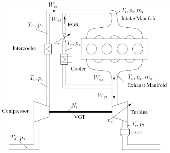 Almost all the proposed controllers are based on very similar third-order control-based models. Figure 3 is a simplified version of Figure 1 and it focuses on the VGT-EGR problem. At the bottom of the figure, we can see the turbocharger which consists of a variable geometry turbine connected through a shaft to the compressor. By adjusting the angle of the guide vanes of the turbine, we can change the flow rates and efficiency. This feature allows us to overcome the old problem of turbine overspeeding at high engine speed. The energy of the exhaust gas coming from the cylinders rotates the turbine (on the way out of the engine) and therefore the compressor rotates boosting the intake manifold pressure with fresh air. On the other hand, the other portion of the exhaust gas comes through the EGR valve and gets mixed with the boosted air in the intake manifold; then the mixture is pumped into the cylinder. The EGR cooler reduces the temperature of the exhaust gas which will help to reduce the combustion temperature, thus producing less NOx. The intercooler following the compressor helps to condense the air resulting in more power density as well as reducing the intake manifold temperature. The fuel is injected into the cylinder and burned, producing the torque on the crank shaft.