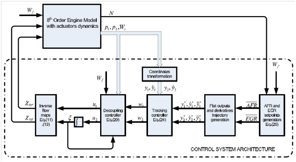 As in the sliding mode technique, the optimal set points of the AFR and EGR ratio are identified from experimental data and tabulated in look-up tables as in equation (5). The desired flat output and its derivatives are then compared to the actual ones and the difference enters the feedback linearization process. The resulting control inputs (Wegr and Wt) are passed through inverse flow maps to get the VGT vane command (θvgt) and EGR valve command (θegt).