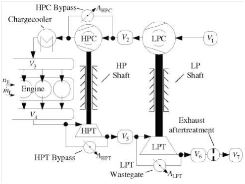 In the proposed controllers in section (2.2), the limitations of the turbocharger were not considered except in the flatness control and the predictive control which are ‘almost’ not feasible. In fact, the turbocharged engine suffers from problems like turbo lag and boost threshold, which directed the researchers toward using various combinations of turbochargers (series, parallel, or both). In the study done in,10 an internal model control (IMC) approach is used to control a two-stage (series) turbocharged Diesel engine depicted in Figure 6. The turbocharger closer to the engine is called the higher pressure stage (HP) since it operates at higher pressure compared to the low pressure stage (LP) which is closer to the ambient. The low pressure compressor (LPC) is larger and optimized for high mass flows. There are three bypasses with variable cross-sections which gives more choices to optimize the air path. For illustration, the HPC operates at its optimum during low engine speeds, while it is bypassed at high engine speeds and the LPC delivers the necessary boost pressure.