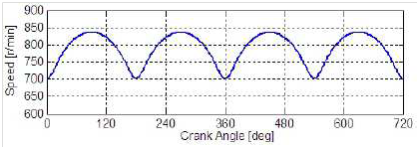 Section (3) indicates that during the transient, the injection is advance shifted to prevent smoke, but causes higher NOx. One suggestion would be to use the electric motor during the transient to alleviate this effect. Another suggestion would be to use the electric generator/motor to get a constant engine speed. Figure 9 shows a 4-cylinder engine speed with respect to the crank angle. It is clear that speed fluctuates within a range, and the mean value is what appears in the RPM gauge. The question is, can we use the generator/motor to absorb and produce torque and have a constant engine speed? If that is possible, then we can reduce the Noise Vibration Harshness (NVH), which will give us more freedom in designing the profile of the injection (pilot, main, secondary) to get less NOx and smoke.