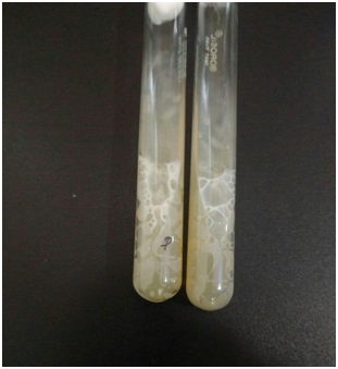 10g soil sample was dissolved in 25ml sterile water and shaken vigorously. This was centrifuged in table top centrifuge at 5000rpm to settle the soil particles. The supernatant was filtered through Whitman filter paper-24 to remove the eukaryotic microbes. The filtrate was used for detection of Klebsiella pneumoniae. A loopful of filtrate was streaked on nutrient media in triplicate plates and incubated at 30˚C temperature for 5 days. Colonies obtained in the isolation plates were further purified to obtain the pure culture of the bacterium. Observation for the frothing bacterial culture (Figure 1) characteristic of Klebsiella pneumoniae was taken.