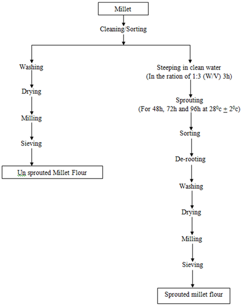 Three kilograms (3kg) of millet grains were cleaned and sorted manually to remove dirt and stones. The millet grains were steeped in the ratio of 1:3 (W/V) in clean water in covered plastic containers for 3h, this was done for the grains to imbibe water for easier germination. The soaked millet grains were spread on a wet jute bag covered with muslin cloth and another jute bag, was used to cover the grains. The millet grains were allowed to sprout for 48h, 72h and 96h at the temperature of 28°C ± 2°C. Water was sprayed on the grains at 12h intervals to keep the germinating grains moist. The grains were turned at intervals to ensure proper aeration and the minimization of mould growth. The sprouted millet grains were derooted, dehusked, washed, sorted and dried at 105°C for 1h in a Gallenkamp oven drier. The dried sprouted millet grains were separately milled using disc attrition mill and sieved with a 1mm sieve size to obtain flours of uniform particles size and stored in a labeled air tight polyethylene bags at room temperature for analysis.