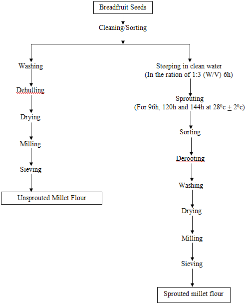 Three kilograms (3kg) of African breadfruit seeds were cleaned and sorted manually to remove dirt and stones. The breadfruit seeds were steeped in the ratio of 1:3 (W/V) in clean water in covered plastic containers for 6h, this was done for the seeds to imbibe water for easier germination. The soaked breadfruit seeds were spread on a wet jute bag covered with muslin cloth and another jute bag was used to cover the seeds. The breadfruit seeds were allowed to sprout for 96h, 120h and 144h at the temperature of 28°C ± 2°C. Water was sprayed on the seeds 12h intervals to keep the germinating seeds moist. The seeds were turned at intervals to ensure proper aeration and the minimization of mould growth. The sprouted breadfruit seeds were derooted, dehusked, vashed, sorted and dried. The dried sprouted breadfruit seeds were separately milled using disc attrition mill and sieved with a 1mm sieve size to obtain flours of uniform particle size and stored in labeled air tight polyethylene bags at room temperature for analysis (Figure 1 & 2).