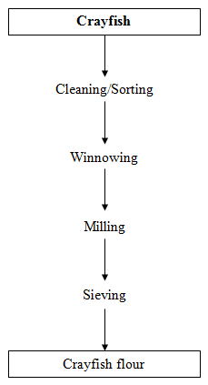 The crayfish was cleaned, sorted, winnowed and dry milled in an electric blender (National, Model Mk 308, Japan). The milled crayfish sample was sieved with 1mm sieve size to obtain the flour. The crayfish flour was packaged in labeled air tight polyethylene bag and stored at room temperature. Crayfish contains high protein quality, minerals and vitamins5(Figure 3).