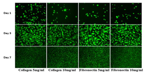 Proliferation of L6 muscle cells: For proliferation assay, cells were seeded in 24 well plates, coated with either no substrate, collagen at concentrations of 5ug/ml, and 10ug/ml and fibronectin at concentration of 5ug/ml, 10ug.ml, of each substrate type in triplicate. The wells were loaded with an initial density of 10,000 cells per well and stored at 37 degrees C. After 0, 3, and 7 days of incubation cells were washed with PBS twice and incubated for 15 minutes in a dark area with 200 ul of Calcein AM stain. Fluorescent samples were then quantified using a FilterMax F5 Multimode Microplate reader. Image acquisition was performed using an inverted microscope equipped with QImaging camera and QCapture Pro imaging software at 10x objective.