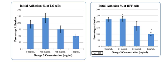 Omega-3 fatty acids are present in certain foods such as flaxseed and fish, as well as dietary supplements such as fish oil. Omega-3 fatty acids have been popularized because of their important roles in human health and development.1–9 Omega-3 can also play an important role in human diseases. Eicosatetraenoic acid (EPA) and docosahexaenoic acid (DHA) are Omega-3 (n-3) fatty acids found in oily fish and fish oil supplements.10–12 In this study we examine the proliferation and adhesion of Human Foreskin Fibroblasts (HFF-1) and L6 muscle cells in the presence of Generic and Synthetic Omega-3. HFF-1 cells as well as L6 cells have proven to be efficient and easy to handle when doing research studies. As a muscle and non-muscle cells they were chosen to understand the impact of Omega-3 in cell adhesion and proliferation. Fibronectin was confirmed to promote cell adhesion at initial phase, in this study day 1. Fibronectin is a glycoprotein of the extracellular matrix that binds to membrane-spanning matrix proteins called integrins. Although Fibronectin has been studies for more than two decades, this remarkably complex molecule is still the subject of exciting discoveries.8 Studies conducted in the past have shown that fibronectin plays a major role in cell adhesion, growth, migration and differentiation. The concentration of Fibronectin can influence the different percentages of growth observed in HFF-1 cells as well as L6 cells. Fibroblasts adhesion to fibrin requires fibronectin, this is important especially in wound healing which Fibronectin has an influence on. A 3D matrix consisting of Fibrinogen and Thrombin was also conducted to show the adhesion and proliferation of HFF-1/L6 cells in the presence of Omega-3. Changing the kinetics of the constituents determines the structural properties of the fibrin architecture.7 Note that 3D models are more like a live biological model as well as allow better understanding of the geometric models of the proteins produced by the cells in study. The relationship between fibrin microstructure, rate of polymerization and structural stiffness have been studied extensively.7
