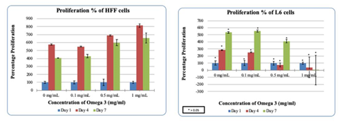 Figure 3(c & d) HFF/L6 cell proliferation in the presence of Omega-3: Higher concentrations of Omega-3 decrease the proliferation of HFF/L6 cells.