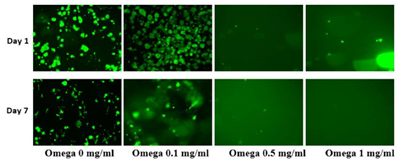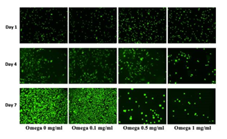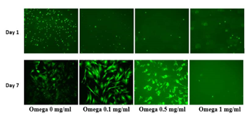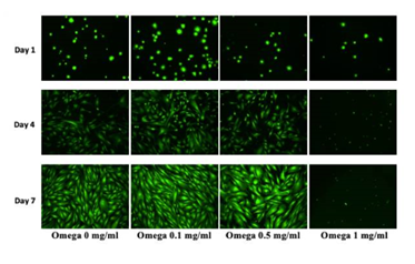 Omega-3 preparation: Cells were seeded in 24 well plates, coated with 10ug/ml of Fibronectin at 4 different concentrations of Omega3; 0mg, 1mg, 5mg and 10mg. Ethanol was used to dissolve the Omega 3. Media was then added to reach a total volume of 2mL. The wells were loaded with an initial density of cells per well and stored at 37 degrees C. After 0, 3, and 7 days of incubation cells were washed with PBS twice and incubated for 15 minutes in a dark area with 200 ul of Calcein AM stain. Fluorescent samples were then quantified using a FilterMax F5 Multimode Microplate reader. Image acquisition was performed using an inverted microscope equipped with QImaging camera and QCapture Pro imaging software at 10x.21–29