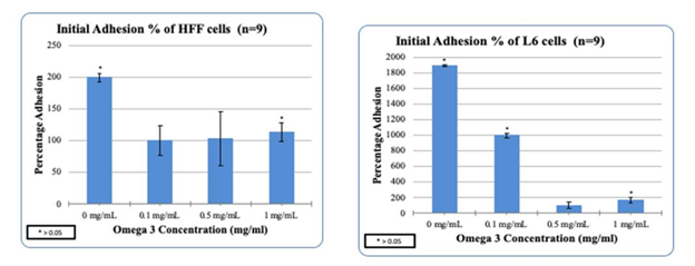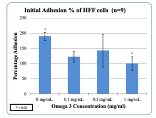 Figure 5(a) HFF cell adhesion in the presence of Omega-3: Higher concentrations of Omega-3 decreased the adhesion of HFF cells.