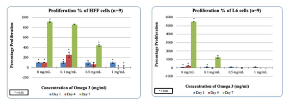 Furthermore, Human Foreskin Fibroblasts (HFF-1) and L6 cells were treated on a Fibronectin matrix in the presence of Generic Omega-3 to examine the proliferation and adhesion of cells. The data supports that Omega-3 slightly increases the adhesion of non-muscle cells. However, HFF-1 cells do not behave the same as L6 muscle cells in this study. A 7-day experiment was conducted and ran three times to measure the interaction between the HFF-1 and L6 cells and Generic Omega-3. Different concentrations of Generic Omega-3 were used and the experiment was conducted three times over a 7-day period and the results were recorded on Day1, Day 3 & 7 (n=9). The results show that the higher concentrations of Generic Omega-3 decreases the adhesion and proliferation of HFF-1 cells. Another alternative was measured to determine the proliferation and adhesion of HFF-1 and L6 cells. This was the introduction of Synthetic Omega-3 and how it impacts the behavior of HFF-1 and L6 cells.