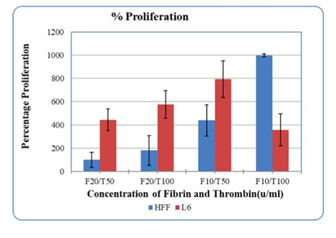 HFF-1 cells were measured for proliferation and adhesion in a Fibrinogen and Thrombin 3D construct. This construct consisting of Fibrinogen and Thrombin forms a 3D environment for the cells known as Fibrin. Different concentrations were examined to determine which environment would be optimal for the adhesion and proliferation of HFF-1 cells. The data shows that the best proliferation is seen on the lower concentrations of Fibrinogen and higher concentrations of Thrombin. This is in accordance with what is seen in the literature, as when there are higher concentrations of Fibrinogen in the polymer, the porosity is lower, therefore promotes lower cell proliferation than the values seen with lower concentrations. There is no statistical difference seen in Figure 4. The HFF-1 cells seemed to adhere and proliferate best in the concentration of F10/T100 as seen in Figure 4A. L6 cells were also analyzed to gain a better understanding. The results seen concluded that L6 cells adhered best in F10/T100 as seen in Figure 4B and had an increase of proliferation in F10/T50.