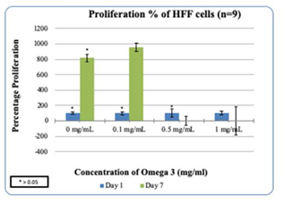 Figure 5(b) HFF cell proliferation in the presence of Omega-3: Higher concentrations of Omega-3 decreased the proliferation of HFF cells.