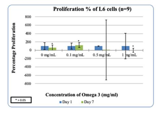 After one hour of incubation higher concentrations of Synthetic Omega-3 decreased the adhesion of L6 cells. Initial adhesion confirmed the presence of L6 cells on Day 1. Cell proliferation is expressed as a percentage of the number of cells present on Day 1 (100%). As seen in Figure 6A, L6 cells proliferate more in the presence of 0.1mg/ml of Synthetic Omega-3 on Day 7 in comparison to 1 mg/mL of Synthetic Omega-3. There was statistical significance between 0 mg/mL and 1 mg/mL as seen in Figure 6B. Overall the proliferation of L6 cells also decreased in a 3D Fibrin construct with higher concentrations of Synthetic Omega-3.