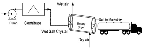 The wet salt crystals as feed resource passing through a rotating cylinder. The rotary dryer has a cylindrical shell. It is constructed from stainless steel plates and slightly inclined. Diameter and length of used rotary dryer is 0.5 meter and 2 meter, respectively. The studied rotary dryer rotates at 4 rpm. Salt as feed stream introduced at the upper end and moved towards the discharge end.