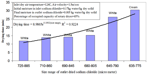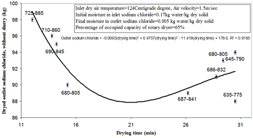 Figure 3 shows the effect of drying time on outlet saline flow rate. Considering the energy consumption and size range of outlet dried salt crystals from rotary dryer, the best drying time is 15.2 minutes. The amount of outlet dried salt crystals is 90 kilo gram per hour when the drying time is 15.2 minutes. The color of outlet dried saline crystals from rotary is cream when the drying time is 30.5 minutes. Therefore, this drying time will be rejected. The maximum deviation between salt production in 12 minutes as drying time and production of dried saline crystals in 15.2 minutes is only 8% but since of the quality of outlet dried saline crystals is optimized in 15.2 minutes so this drying time is introduced as optimized time for drying. Also, the moisture content (kg) per dried salt (kg) in this condition is 0.005. According to the literature, this amount of moisture content in outlet dried saline crystals is very suitable.