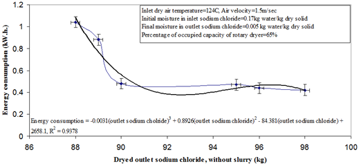The experimental results in Figure 4 show there is a reverse relation between flow rates of outlet dried saline crystal from rotary dryer and the amount of energy consumption. The occupied volume of rotary dryer in this experiment is 60, 65, 70, 75, 80 and 85. So, the amount of dried outlet sodium chloride is increased. In Figure 4 the moisture content of outlet dried salt crystals changes from 0.0048 kg to 0.0075 kg of water per kg of dried salt crystals.