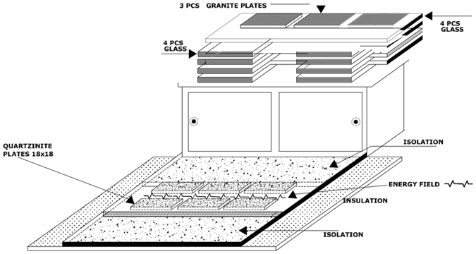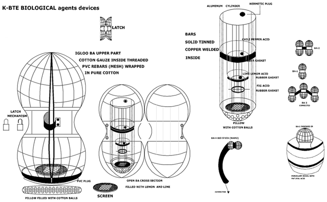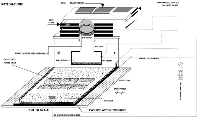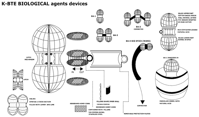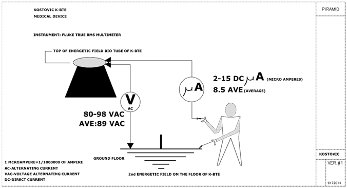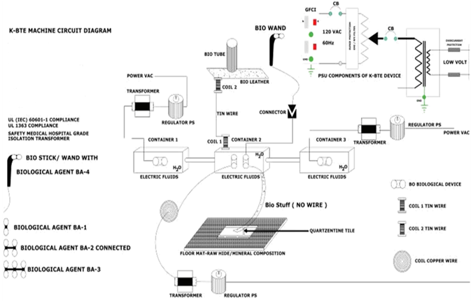 The KBTE Device is created in a proprietary method where we assemble in a special circuitry 120V- DC/AC/RC-reverse current (canceling the magnetic from the electric) which then is transferred through water. After deleting the magnetic aspect we extract the bio electrons from this water (electric fluid), controlling their direction and strength (Micro and Nano amperes frequency). Lastly we add in extracted electrons enriched with a number of natural acids. We incorporate these natural acids into our Biological Agents Device (Figure 1). Today’s scientific formula for electromagnetic current power is: I=V:R (I=current; V=Voltages and R=Human resistance to ground in Ohms). Today's standard technological advanced medical surgeries use lasers which can only perform at the strength/frequency of Mili Amperes, which is: 1A= 1,000 Mili Amperes. Please understand that if the human body’s resistance to ground is 1,000 Ohms and using 120 Voltages which is 1.2 Mili Amperes or 1,200 Micro Amperes, then it’s threshold impact, would result in electric shock and death. This is today’s current official technological development in laser medicine.