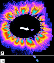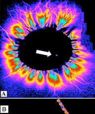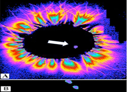 Figure 1 Cat 1: Recording of the glow from the central end of the transected vagus nerve in the high-frequency electromagnetic field. A - in the transverse plane and B - longitudinally. Focal area of glow is 0.04% of the nerve cross-section area (6x3 mm).