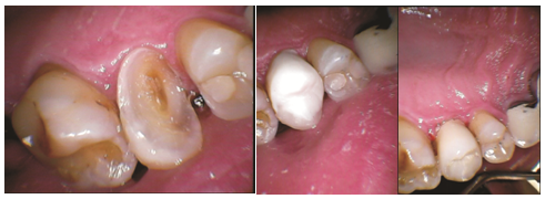 Figure 1 a) Tooth 25, patient FK, deep caries lesion; b) fresh after bioactive restore; c) after 12 weeks.