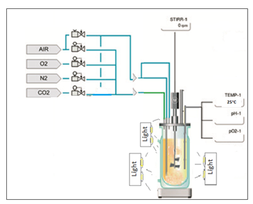 C. vulgaris was grown in a cylindrical stirred tank “Biostat B plus” bioreactor (5L working volume; Sartorius, Germany). Stirring (750 rpm) was provided by a three palettes (UniVessel 5L), each inclined at 45°C from the horizontal axis (pitch blade stirrer) (Figure 1). The total light intensity at the inner surface of the bioreactor was measured (LI250A, LI-COR, USA) at 2900 µmol/m2.s achieved by 6 LED lamps (IKEA LEDARE, 2700 Kelvin, 27°C dispersion angle, France). The culture temperature was maintained at 25°C by circulating water through a jacketed vessel (Figure 1). Continuous aeration with sterile air (0.2 µm Sartorius gas filter) at 500ml air/min (1 atm. 25°C) was used to supply both oxygen and CO2 to the culture. The inlet and outlet airflow rates were measured daily. The sterile medium was inoculated with a shake-flask (50 ml in 250 ml flask) culture of C. vulgaris at the end exponential growth (72-96h). The inoculum volume constituted 1% (v/v) of the bioreactor working volume (5L), which gave a cell concentration of 2 × 106 cells/ml at the beginning of the experiment. The inoculum was prepared in the same medium as that used in the bioreactor (MBM medium containing 10 g/L of glucose).