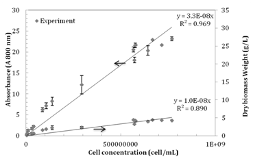 Figure 2The relationships between the different measurement methods of C. vulgaris biomass: corrected absorbance and dry weight concentration were plotted against cell concentration. The standard deviations of measurements for both experiments are presented with error bars.