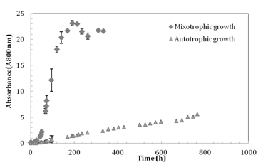 Figure 3 Growth curves for both experiments under mixotrophic and autotrophic growth17 conditions. Corrected absorbance versus time of incubation.