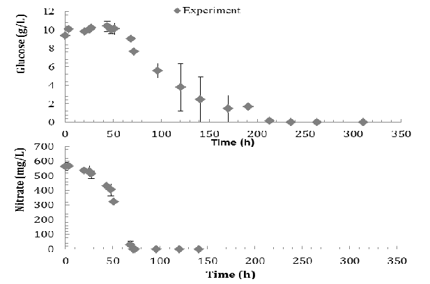 Figure 4 Glucose and nitrate concentrations profiles during C. vulgaris growth. The standard deviation of measurements is presented in the Figure with error bars.