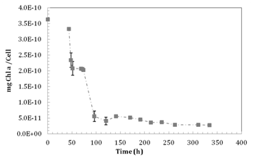 Figure 4 shows that no significant consumption of glucose was observed during the exponential growth phase; this demonstrates autotrophic growth during this growth phase. The end of the exponential growth phase coincided with nitrate exhaustion, suggesting a limitation of growth by nitrogen. Three growth phases can be observed: exponential, transition and stationary phases. During the transition phase, glucose was rapidly removed from the growth medium suggesting mixotrophic growth. The exhaustion of glucose corresponded approximately to the start of the stationary phase as the cell concentration became stable. C. vulgaris exhibited a preference for autotrophic growth as long as nitrogen was available but after complete nitrogen exhaustion, glucose consumption occurred. There were slight differences in glucose consumption and cell growth between the duplicate experiments during the transition phase; elsewhere the repeatability between the experiments was very high. The average cellular chlorophyll α content (mg chlorophyll α per g DW) decreased sharply during the exponential phase and remained approximately constant at a low value afterwards (Figure 5). This could be explained firstly by the decreasing of nitrates concentration in the medium that influence the chlorophyll production and secondly by the change of cell physiology upon glucose metabolism. This behavior was also observed by Illman et al.23and Li et al.24 for the same microorganism in mixotrophic cultures. In this study, after exponential growth, the cellular chlorophyll content decreased to a constant value of 5× 10-11 mg/cell. According to Kong et al.25 a high glucose concentration (>5 g/L) inhibited chlorophyll production.