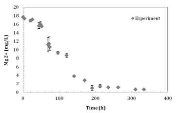Where k.a is the kinetic constant, the concentrations C, C0 and Ceq are the Mg2+ ion concentrations at times: t, t0 and at equilibrium respectively (mg/L).