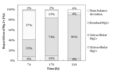 Figure 7 Repartition of Mg2+ ions in the biomass during growth. The mass balance deviation refers to the amount of Mg2+ ions that could not be accounted for. The error bars show the difference in the results observed between the two experiments.