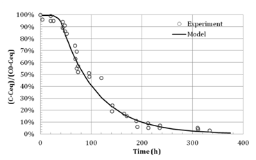 The experimental results were plotted versus the predicted model curve (Figure 8). They fitted well with the exponential model for magnesium uptake by C. vulgaris confirming its applicability. These results were in good agreement with our previous published work,10 where we developed an exponential model for the Mg2+ ion uptake by C. vulgaris in shake-flask autotrophic cultures with different initial Mg2+ ion concentrations (8.9-465 mg/L). Two differences were found with our previous work.10,11 firstly Ceq seems to be negligible and secondly Mg2+ ion uptake starts after a lag time of 45 h from the start of the experiments. This shows that the majority of the ion is accumulated while growth occurs under heterotrophic conditions. In other words, the exchange surface produced by the greater growth brought about by heterotrophic growth dominated the Mg2+ ion adsorption and absorption phenomena. This model described well the Mg2+ ion uptake by C. vulgaris. Future experiments will be performed to explore Mg2+ ion uptake under different glucose and initial Mg2+ ion concentrations and to find suitable explanations for the different behaviors observed in this study.