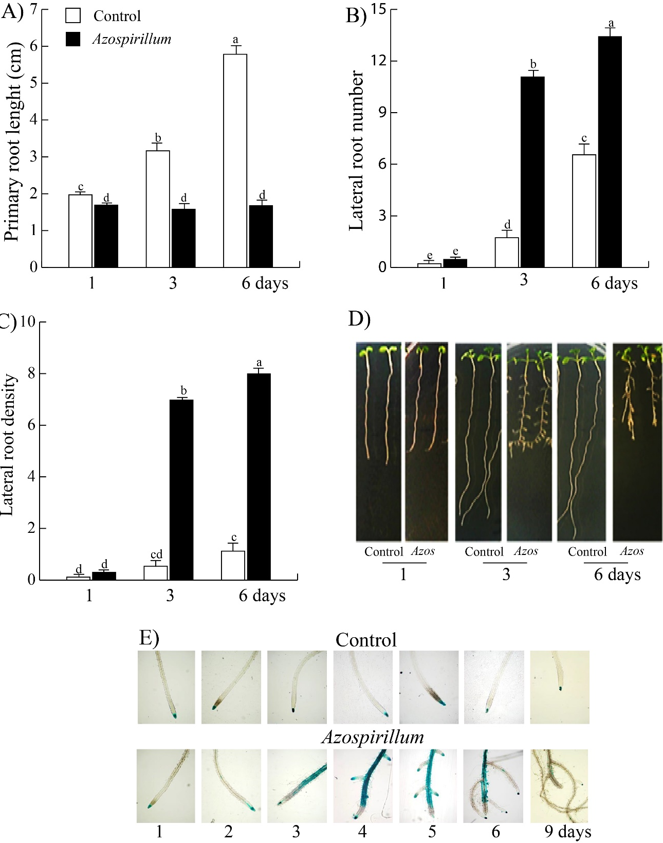 Figure 1 Effect of Azospirillum brasilense Sp245 on root architecture and auxin levels in roots of Arabidopsis. Arabidopsis Wt seedlings were transferred to control media and supplemented with 2.5x10⁵ CFU/mL of Azospirillum, and incubated by 1, 3 and 6 days. A) Primary root length. B) Lateral roots number. C) Lateral roots density. D) Representative photographs of seedlings grown in control medium and inoculated with 2.5x105 CFU/mL of A. brasilense. Values represent the mean of thirty seedlings +/- standard error. The letters indicate the statistically significant differences between the parameters of the Tukey test (P≤0.05). The experiments were repeated in triplicate with similar results. E) DR5::uidA seedlings were transferred to control media and supplemented with 2.5x10⁵ CFU/mL of Azospirillum and incubated by 1, 2, 3, 4, 5, 6 and 9 days. At the end of incubation time, the seedlings were treated with X-Gluc, followed by a clearing process. The seedlings were mounted on slides and microscopic observations were made at 4X magnification. Representative photographs of the roots of the seedlings in the control medium and inoculated with Azospirillum of at least 25 seedlings from three different trials with similar results are shown.