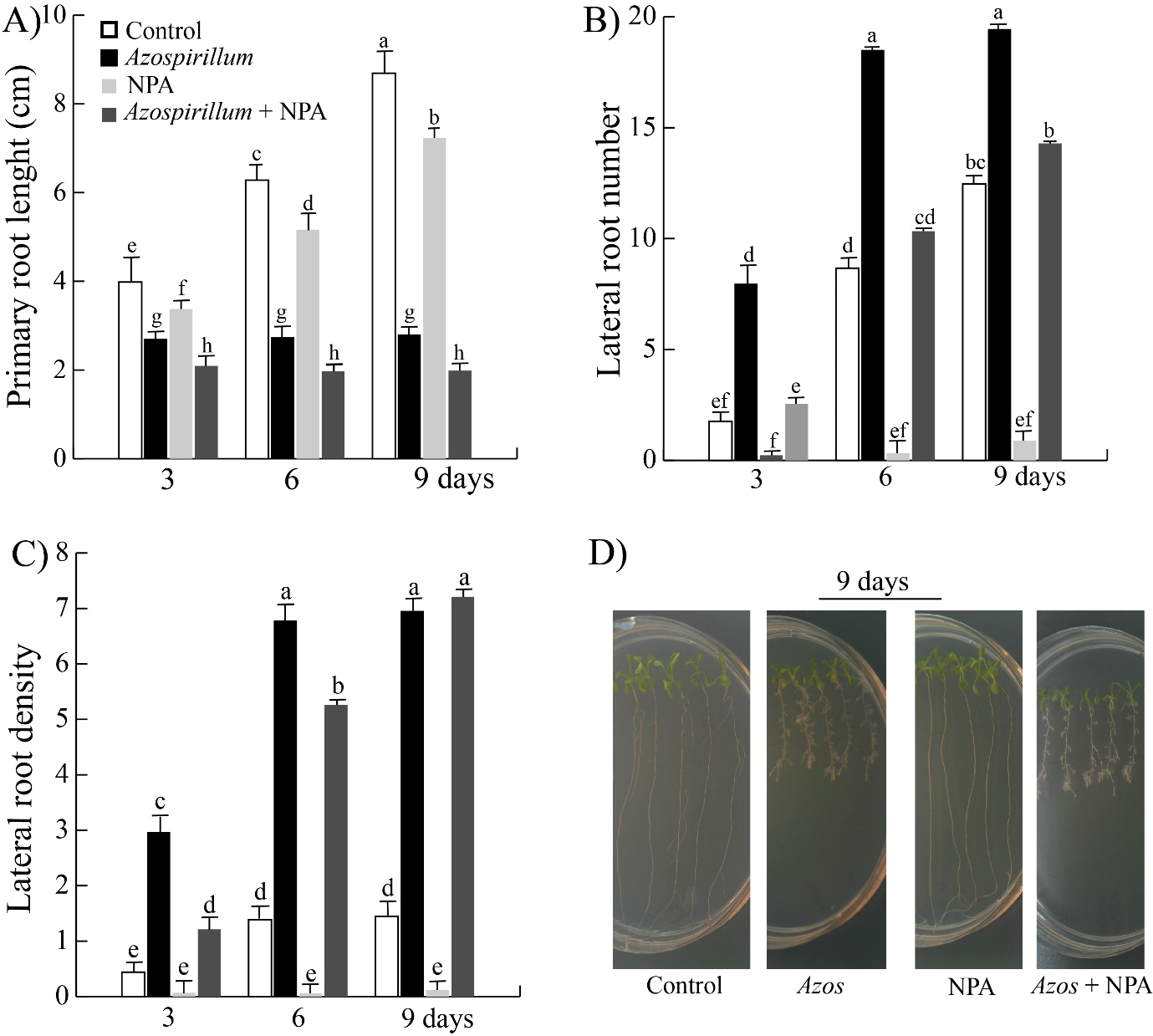 Figure 2 Effect of PAT inhibition on the root architecture of Arabidopsis seedlings exposed to Azospirillum. Arabidopsis Wt seedlings were transferred to control media and supplemented with 2.5x10⁵ CFU/mL of Azospirillum, added both media with NPA (1 µM) and incubated by 3, 6 and 9 days. A) Primary root length. B) Lateral roots number. C) Lateral roots density. D) Representative photographs of seedlings. Values represent the mean of thirty seedlings +/- standard error. The letters indicate the statistically significant differences between the parameters of the Tukey test (P≤0.05). The experiments were repeated in triplicate with similar results.