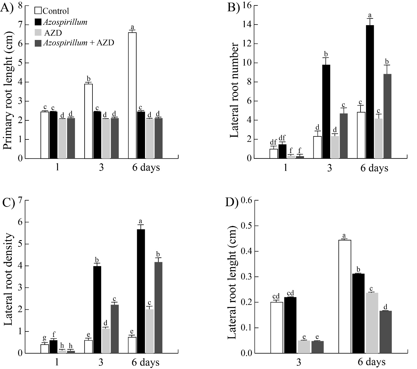 5 day-old seedlings were transferred to Petri dishes containing 0.2X MS medium with 2.5X105 CFU/mL of A. brasilense or without the bacterium, and at culture mediums supplemented with the 1 µM NPA or 1000 nM AZD-8055. The seeded Petri dish were incubated for one, three, and six days in the plant growth chamber under the aforementioned conditions.