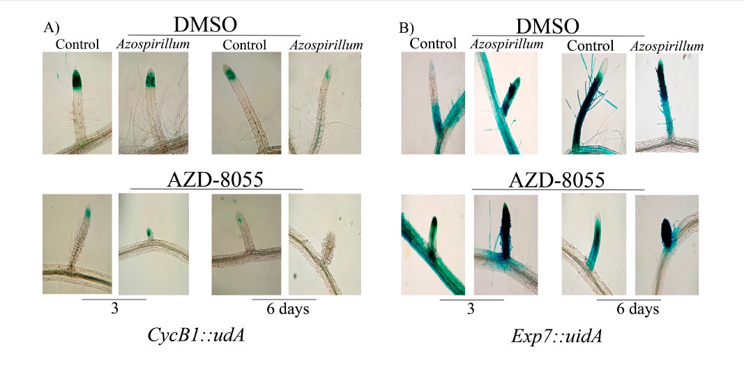 Figure 6 Effect of TOR inactivation on CyB1::uidA and Exp7::uidA expression in Arabidopsis lateral roots. A) Arabidopsis CycB1::uidA and b) Exp7::uidA seedlings were transferred to control medium and supplemented with 2.5x105 CFU/mL of Azospirillum, added both media with AZD-8055 (1000 nM) and incubated by 3 and 6 days. At the end of the incubation time, the seedlings were treated with X-Gluc, followed by a clearing process. The seedlings were mounted on slides and microscopic observations were made at 4X magnification. Representative photographs of the lateral roots from the seedlings in the control medium and inoculated with Azospirillum of at least 25 seedlings from three different trials with similar results are shown.