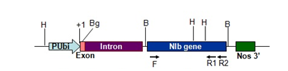 Figure 1 Linear map of pAHC-NIb. PU bi-Ubiquitin promoter, F-NIbEF1 primer, R1-NIbER1 primer, R2-NIbmutrev primer, H-HindIII, Bg-BglII, B-BamHI, +1-Transcription initiation site.