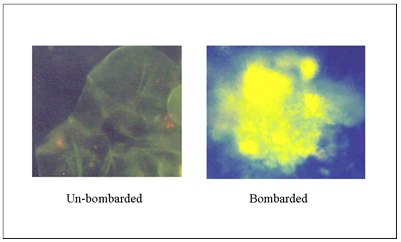 Callus induction was observed from the inner core region of the cardamom rhizome on MS medium supplemented with the plant growth regulators like 9.0 μM2,4-dichloro phenoxy acetic acid (2,4 D), 2.3 μM Kinetin and additives like 0.1% casein hydrolysate and 0.1% polyvinyl pyrrolidone (PVP) after a period of 30 days. The explants exhibited swelling within four weeks, followed by the development of whitish callus after another six to eight weeks. Large number of white, soft and friable calli were obtained after 60 days by sub-culturing twice in the same medium. After two subcultures, non-embryogenic, loose calli were obtained. These embryogenic calli were used for the bombardment.