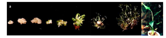 Non-transformed embryogenic cells were initially cultured on media containing 1 to 6 mg/l of bialaphos. Growth was significantly reduced at 4 mg/l concentration. Hence, after bombardment, without disturbance, the embryogenic cell masses were transferred to selection medium with bialaphos (4 mg/l). During selection on bialaphos-containing medium, untransformed calli gradually turned brown and bialaphos resistant calli remained embryogenic. After five weeks, the surviving embryogenic calli were viewed under a fluorescence microscope to rule out transient expression of GFP (Figure 2). The bombarded calli developed into plantlets after six months when they were sub-cultured in regeneration medium (Figure 3).