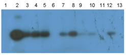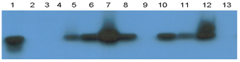 Figure 4 Southern hybridization of transgenic plants with NIb probe (1.5kb fragment amplified from pAHC NIb with NIbEF1 and NIb mitrev primer (Figure 1)) NIb probe (lanes 1 & 23), non-transformed plants (lanes 13 & 22), transgenic plants 1(2), 2(3), 3(4), 23(5), 35(6), 41(7), 71(8), 80(9), 90(10), 91(11), 93(12), 97(14), 99(15), 100(16), 101(17), 103(18), 104(19), 106(20) & 107(21).
