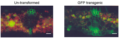 GFP expression was observed under a florescence microscope for embryogenic calli (3 weeks post bombardment) and for leaf sections from transgenic plants. Leaves from non-transgenic plants were used as control.