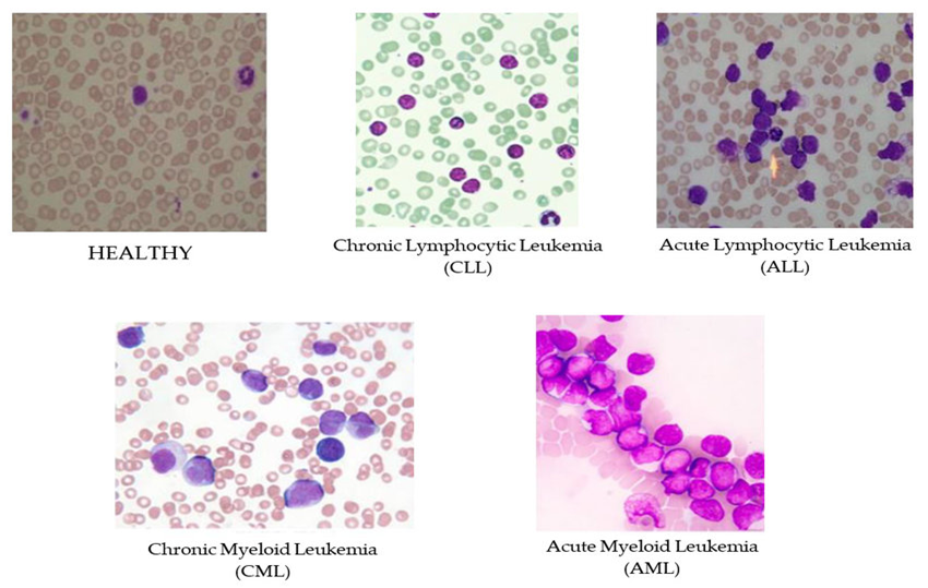 Figure 1 This figure shows the differences in blood cell appearance between a healthy person and individuals with various types of leukemia. The top left image represents a healthy blood smear, where red and white blood cells appear in a normal distribution and shape. The other images illustrate blood affected by different forms of leukemia. In Chronic Lymphocytic Leukemia (CLL), there is an increase in small, mature-looking lymphocytes with slightly irregular shapes. Acute Lymphocytic Leukemia (ALL) shows many large, immature lymphocytes called blasts, which have prominent nuclei. Chronic Myeloid Leukemia (CML) displays an excess of both mature and immature granulocytes, such as neutrophils and basophils. Finally, in Acute Myeloid Leukemia (AML), there is a high concentration of large, immature myeloid cells known as myeloblasts, with noticeable nuclei. These images help doctors identify and understand the specific changes in blood cells that occur with each type of leukemia.47