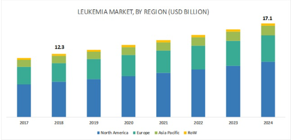 Figure 2 Leukemia Market by Region (2017–2024, USD Billion). This bar chart illustrates the leukemia market size from 2017 to 2024, segmented by geographic regions: North America, Europe, Asia Pacific, and Rest of the World (RoW). The data highlights the growth in market value over the years, with North America consistently holding the largest market share, followed by Europe and Asia Pacific. The market value, which stood at USD 12.3 billion in 2018, is projected to reach USD 17.1 billion by 2024. The increasing market size reflects advancements in leukemia treatments, higher diagnosis rates, and a growing demand for effective therapies across regions.48