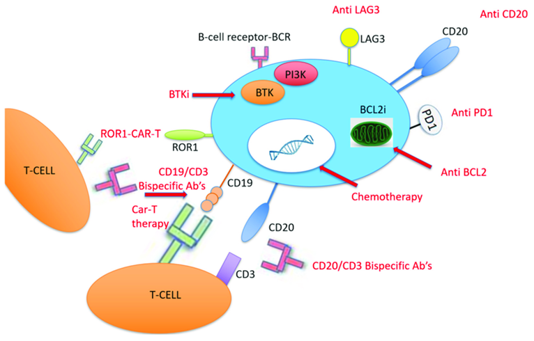 Figure 4 This diagram shows different therapies used to treat Richter Transformation, a condition where a slow-growing leukemia (chronic lymphocytic leukemia, or CLL) becomes more aggressive. In the center is a B-cell, the type of cell affected by CLL. Various treatments target specific parts of this cell to stop it from growing or to help the immune system destroy it. For example, some drugs block the B-cell’s receptors, stopping survival signals. Other treatments, like CAR-T therapy, use T-cells (another type of immune cell) modified to attack the cancerous B-cells by targeting markers like CD19, CD20, and ROR1 found on their surface. Inhibitors like BTK and PI3K also block signals that the cancer cells use to grow. Additional treatments aim at proteins, like BCL2, to make cancer cells more responsive to chemotherapy. Immune checkpoint inhibitors, like Anti-PD1 and Anti-LAG3, help T-cells recognize and attack the cancer cells. Together, these therapies aim to improve the treatment’s effectiveness by focusing on specific parts of the cancer cells and boosting the body’s immune response.50