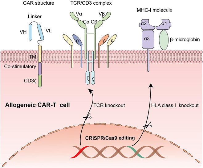 Figure 5 This diagram shows the structure and genetic modification of allogeneic CAR-T cells, which are T-cells modified to attack cancer cells and can be used for different patients. The CAR structure includes parts that allow the T-cell to recognize and attack cancer cells. It has variable regions (VH and VL) that help bind to cancer cells, a signaling part (CD3ζ) to activate the T-cell, and other domains for stability and activation. In normal T-cells, the TCR/CD3 complex helps recognize threats, but in CAR-T cells, the CAR structure takes over this role, allowing direct targeting of cancer cells. To make allogeneic CAR-T cells safe for use in multiple patients, scientists use CRISPR/Cas9 gene editing to "knock out" or remove certain genes. They delete the TCR gene to stop the CAR-T cell from attacking the patient’s healthy cells. They also remove the HLA class I gene to prevent the patient’s immune system from rejecting the CAR-T cells. These genetic changes make allogeneic CAR-T cells safer and more suitable for broader use in cancer treatment.51