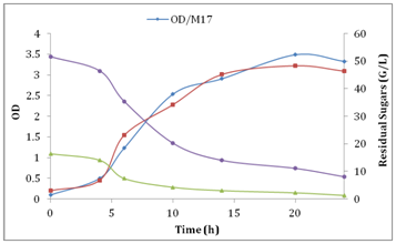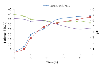 The figure shows the growth profiles (OD620) of carbohydrate consumption and lactate production in the optimized medium and in the M17 medium. Streptococcus thermophilus strain develops immediately without latency phase and reached the stationary phase after13h of culture in the optimized medium while it reached this period in M17 medium just after 10-20h. On the one hand, biomass profiles are similar during active growth phase, but a perceptible difference in the final biomass. Finally, for the both studied cultures, the maximum biomass (DO) coincides with the consumption of the majority of the carbon substrate (sugars= 8.11g/l in the 24 hours of fermentation). It also appears that the growth and production lactic acid is inhibited when the pH falls to 4.23 in M17 medium and 4.63 in the optimized medium. This is due to the strong acidity resulting from the accumulation of lactic acid (Figure 1 & 2).12 Concluded that the inhibition may be due to carbon source depletion. But in our work, this is not the case, because the consumed sugars concentration equal 44.41g/l, so it remains 8.11g/l of sugars in the optimized medium not consumed by the bacteria. From these results, we find that the sugar consumption profile and the lactic acid and biomass production during the batch fermentation of the optimized medium with date juice is similar to the M17. The comparison of the kinetics of the two curves shows that the optimized medium effectively improves the production of lactic acid with a final concentration of 46.26g/l while the M17 medium produced only 36.9g/l.
