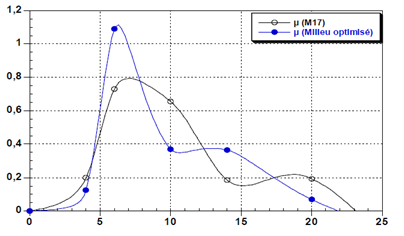 The specific rate of growth profiles (μ) of S. thermophilus on the M17 and optimized media medium are illustrated in Figure 3. The results of the specific growth rate μ showed positive values. At the beginning of the fermentation, the specific rate of growth of S. thermophilus, inoculated on an optimized culture medium was zero and reached a maximum value of 1.09h-1. In contrary, the culture of S. thermophilus in M17 medium showed that the specific growth rate is low in the first hours of fermentation and reached a maximum value of 0.73h-1.