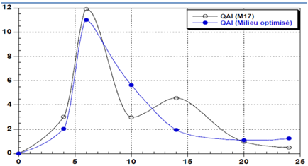 The specific rates of lactic acid production of both fermentations on M17 and optimized medium showed identical maximum values of about 11.02g/gh, overlapping, decrease and cancel after 22 hours of fermentation (Figure 4).